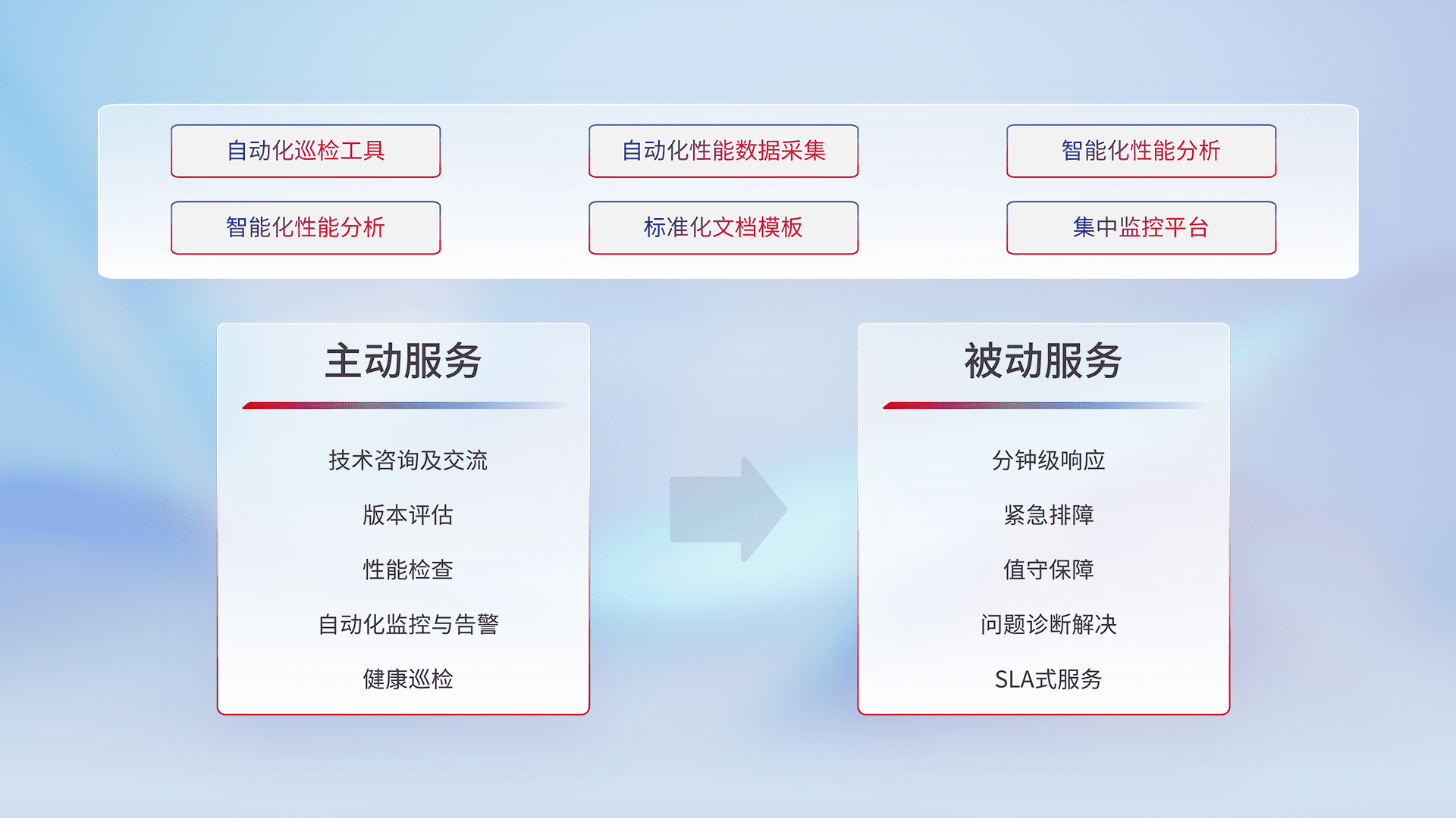 智能化工具和标准化文档,,,,保障服务质量,,,,提供主动服务(包含技术咨询、、、版本评估、、、、性能检查、、、自动化监控与告警、、、、健康巡检)和被动服务包含(分钟级响应、、紧急排障、、、、值守保障、、、问题诊断解决、、、、SLA服务)。。。