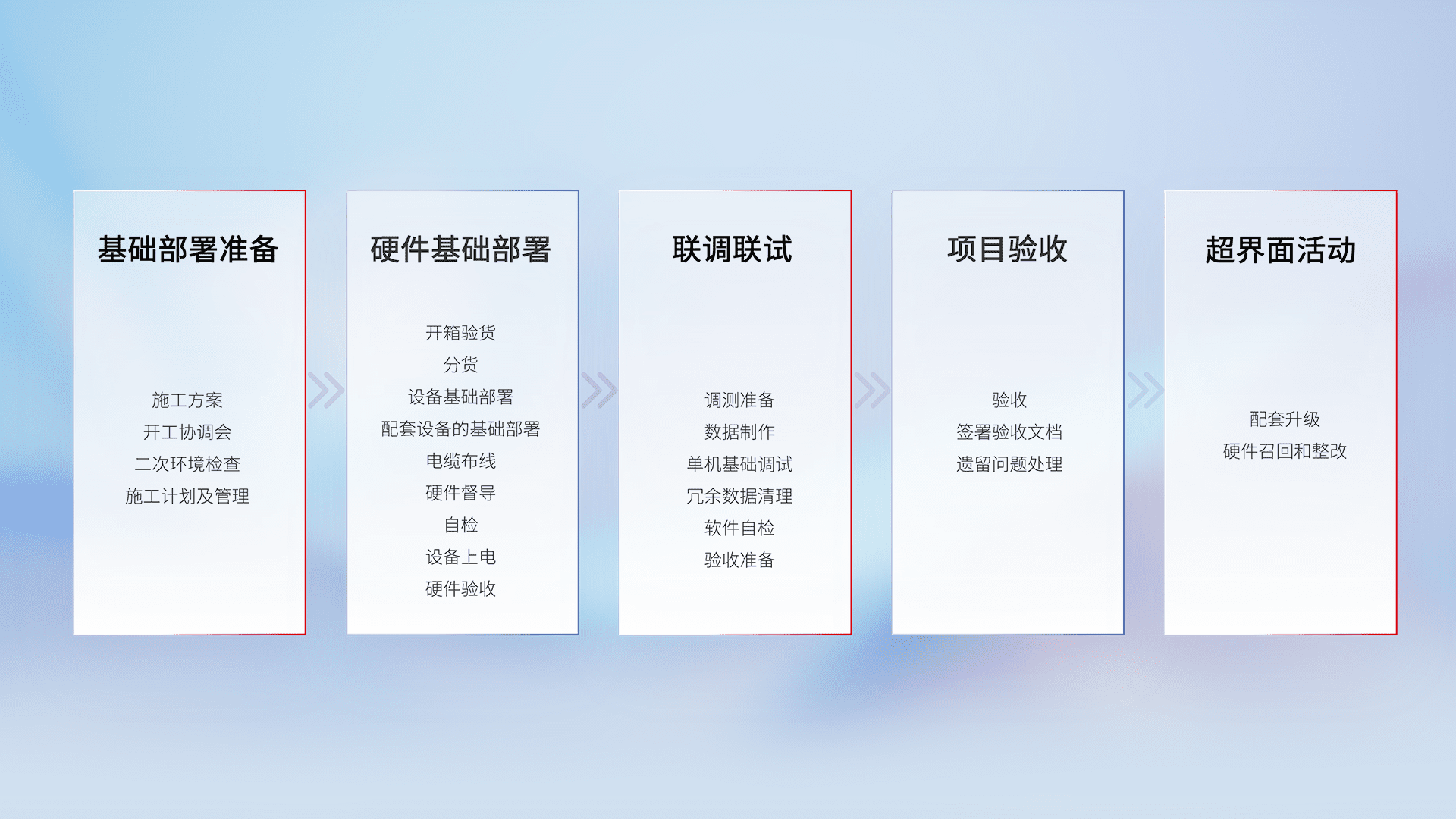 从基础部署准备、、硬件基础部署、、、联调联试、、项目验收、、、越界面活动的全过程可追溯,,保证施工质量和进度。。。。